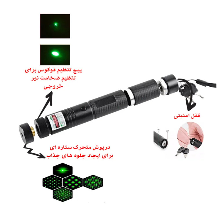 این لیزر حرفهای با پرتوی سبز بسیار درخشان و متمرکز، از باتری شارژی قدرتمند بهره میبرد و با قفل ایمنی مخصوص برای جلوگیری از استفادهی ناخواسته یا خطرناک طراحی شده است. بدنهی دستگاه از آلومینیوم مقاوم و سبک ساخته شده و طراحی ارگونومیک آن، تجربهای لذتبخش و مطمئن هنگام استفاده فراهم میکند.